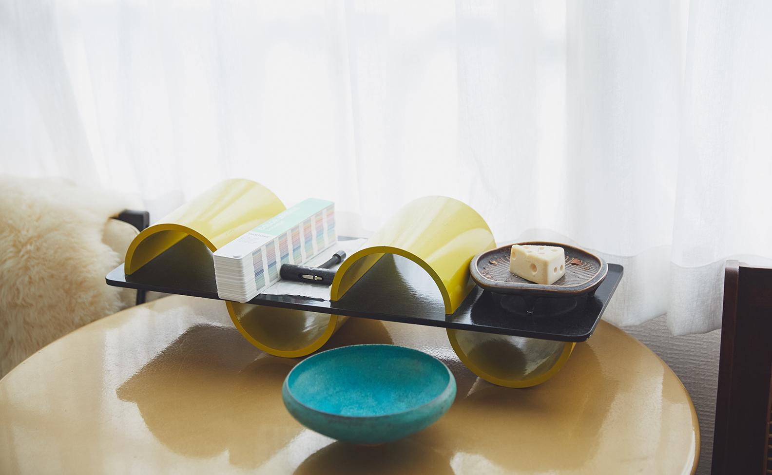 チルスペースのテーブルに置いているのは、清澄白河のギャラリー「stoop」でポストモダン展をしていたときに見つけたもの。ブックスタンドや新聞をしまうラックとしても使える収納道具ですが、色も形もオブジェのような存在感がありますよね。
