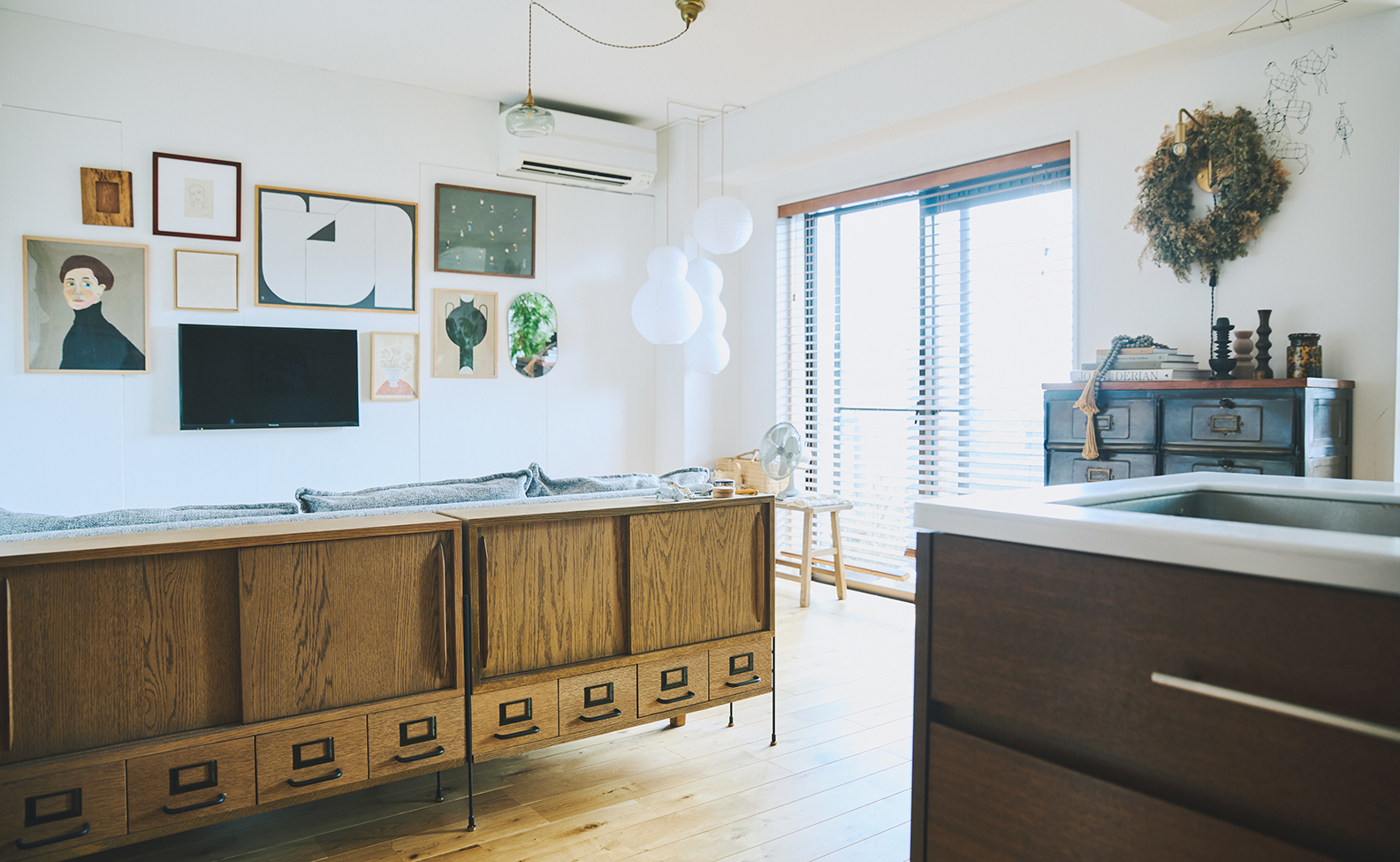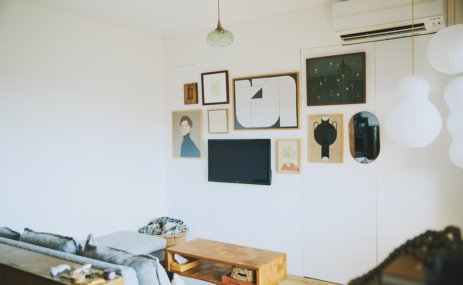 大きな作品は目線の高さに置いて部屋を広く見せたり、大きめのアートをジグザグに配置して視線にリズムをつけたりしています。また、額の質感や色はあえて統一せず、リネンのパネルやオーバルのミラーなど異素材をミックス。黒を含むアートを適度に織り交ぜることで、テレビの黒が浮かず、存在感をやわらげてくれます。