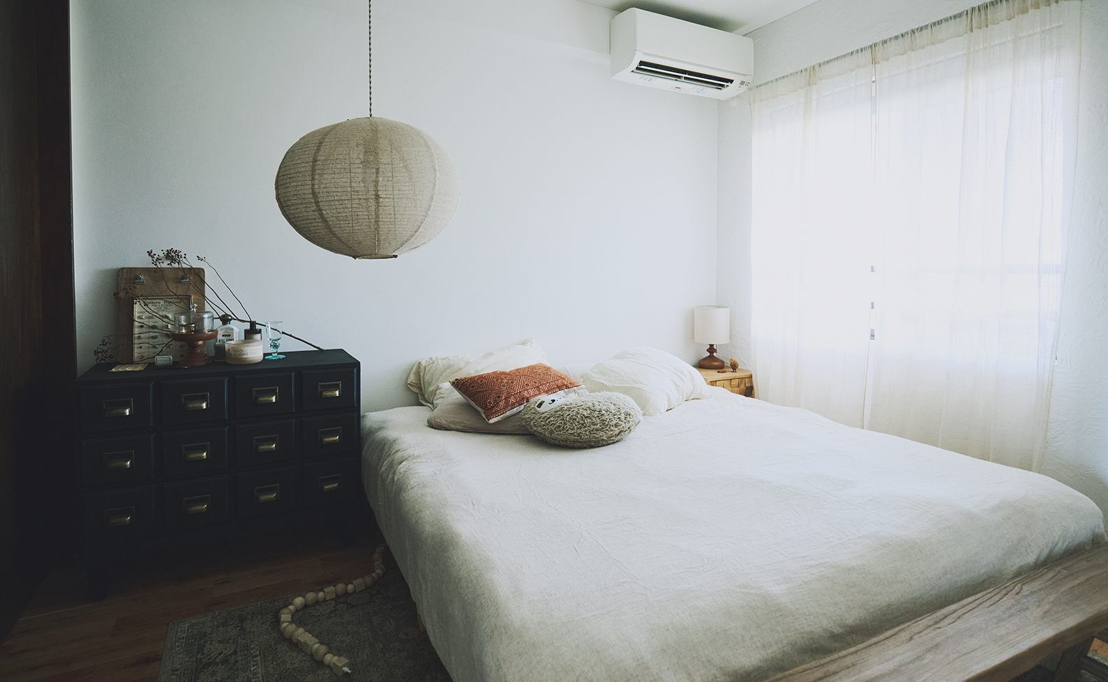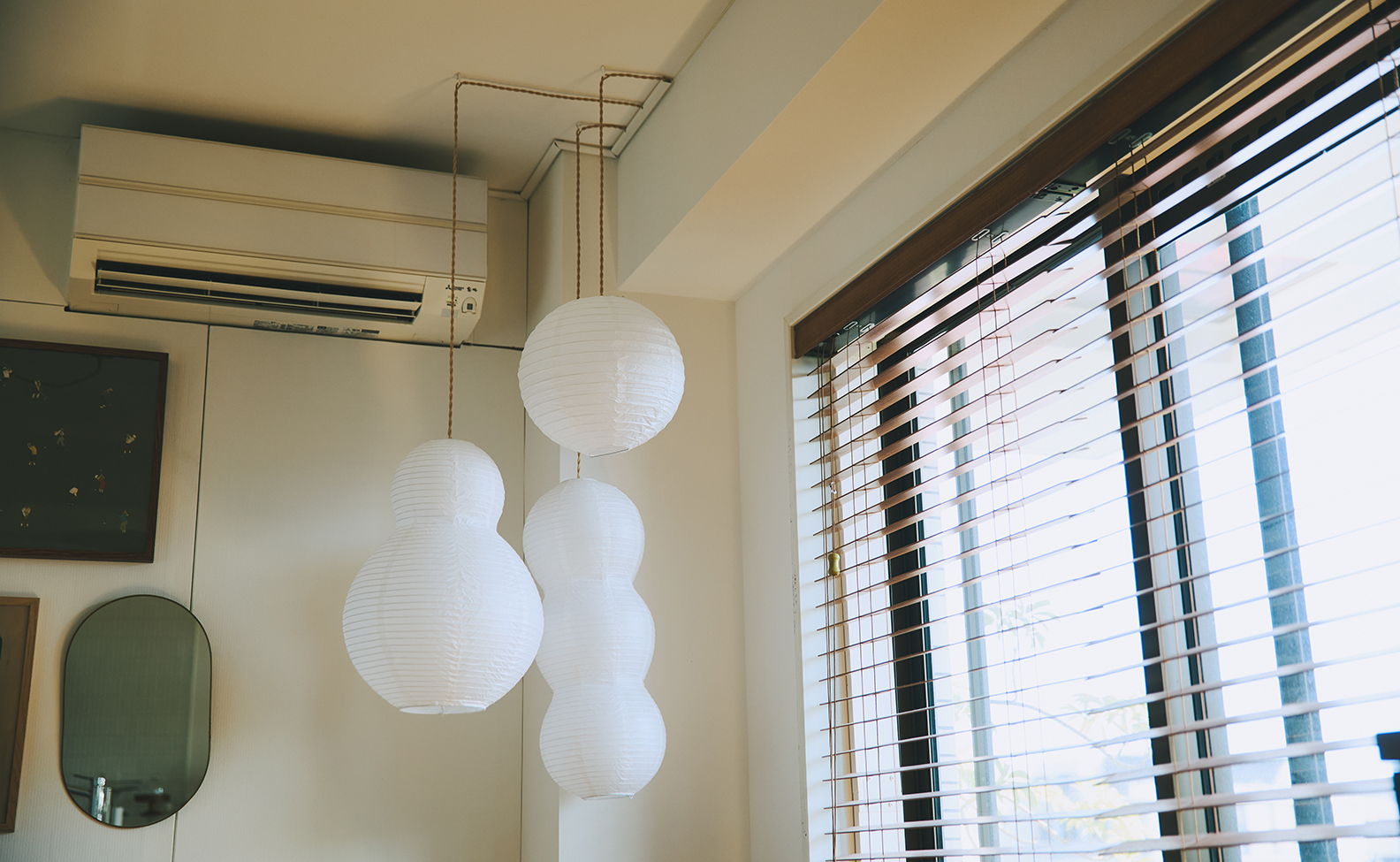 デンマークで購入した〈Normann Copenhagen〉のものと、ネットで見つけたノーブランド品を組み合わせて飾っています。コペンハーゲンのショールームで、いくつか重ねて吊るしている様子がかわいくて、我が家でも複数使いにしました。Normann Copenhagenの和紙ライトは、海外製のわりに小ぶりで日本の部屋とも相性が良いです。和紙のように柔らかい光で、部屋全体をふんわり包んでくれます。