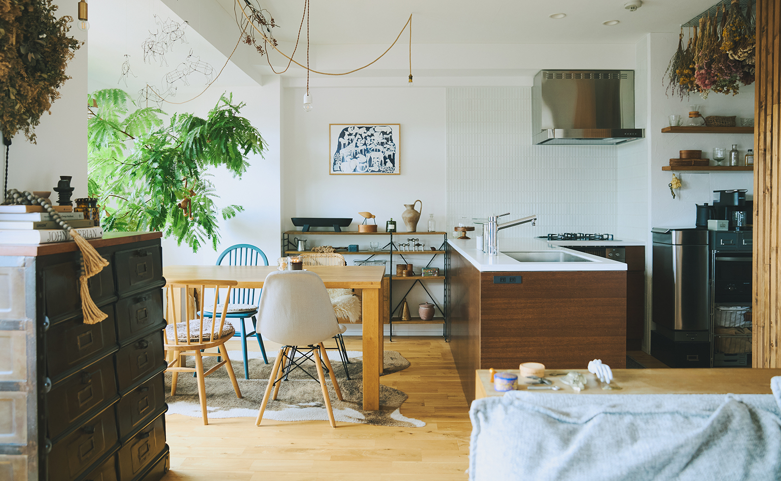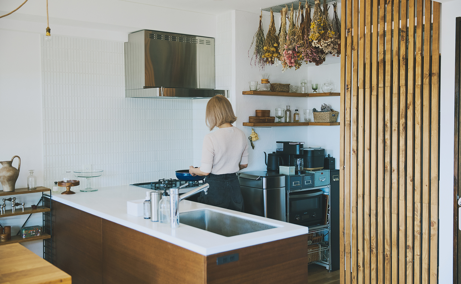 壁を自作し、家具をリメイクし、いつも愛でたい好きなものを飾る。賃貸でも自分らしい暮らしをとことん追求するsakiさん。後編では、原状回復できるDIYの工夫やすっきり整える収納のこだわり、デンマークで出会った宝物について伺いました。