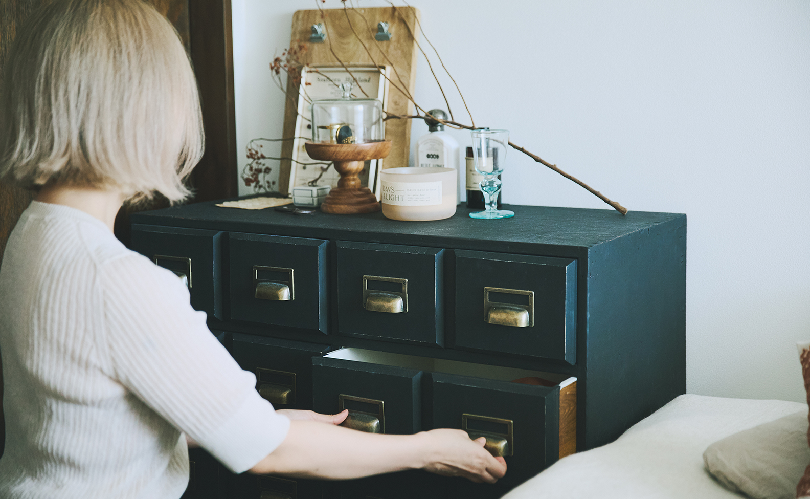 寝室には、和ダンスをリメイクしたドロワーチェストを置いています。ヨーロッパヴィンテージのドロワーキャビネットをずっと探していたのですが、良いと思ったものは驚くような価格だったのでDIYしました。メルカリで4,000円の和ダンスを購入し、ソファー用の木製脚を取り付け、引き出しは木工所で面取り加工してもらった板を前板に重ねて、全体を塗装とヤスリでヴィンテージ風に仕上げました。見た目は小さな引き出しがたくさんあるように見えますが、実際は6つ。デザイン性と実用性、どちらも重視しました。