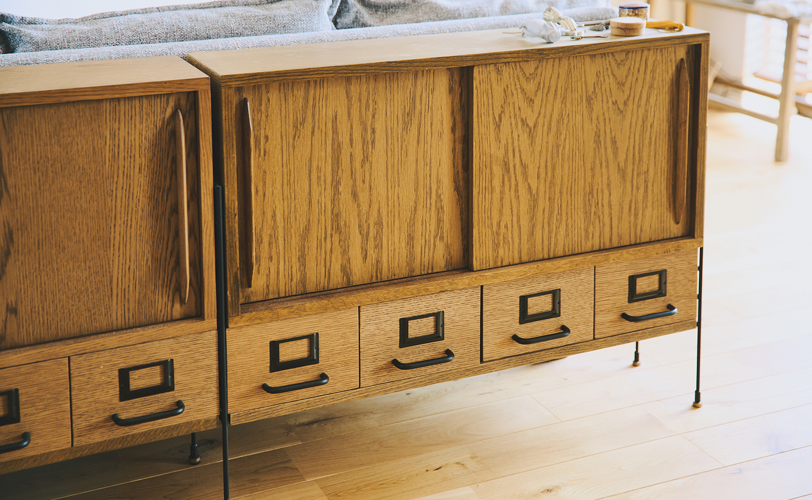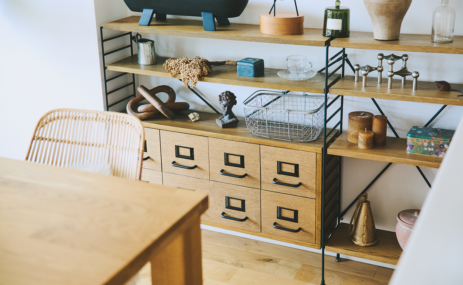 リビングとダイニングの棚はそれぞれ〈Re:CENO〉のもの。それぞれ下段はオープン棚とガラス扉でしたが、DIYで引き出しを追加し、徹底して隠す収納に。取っ手とネームタグも付け、愛らしく実用的に仕上げています。