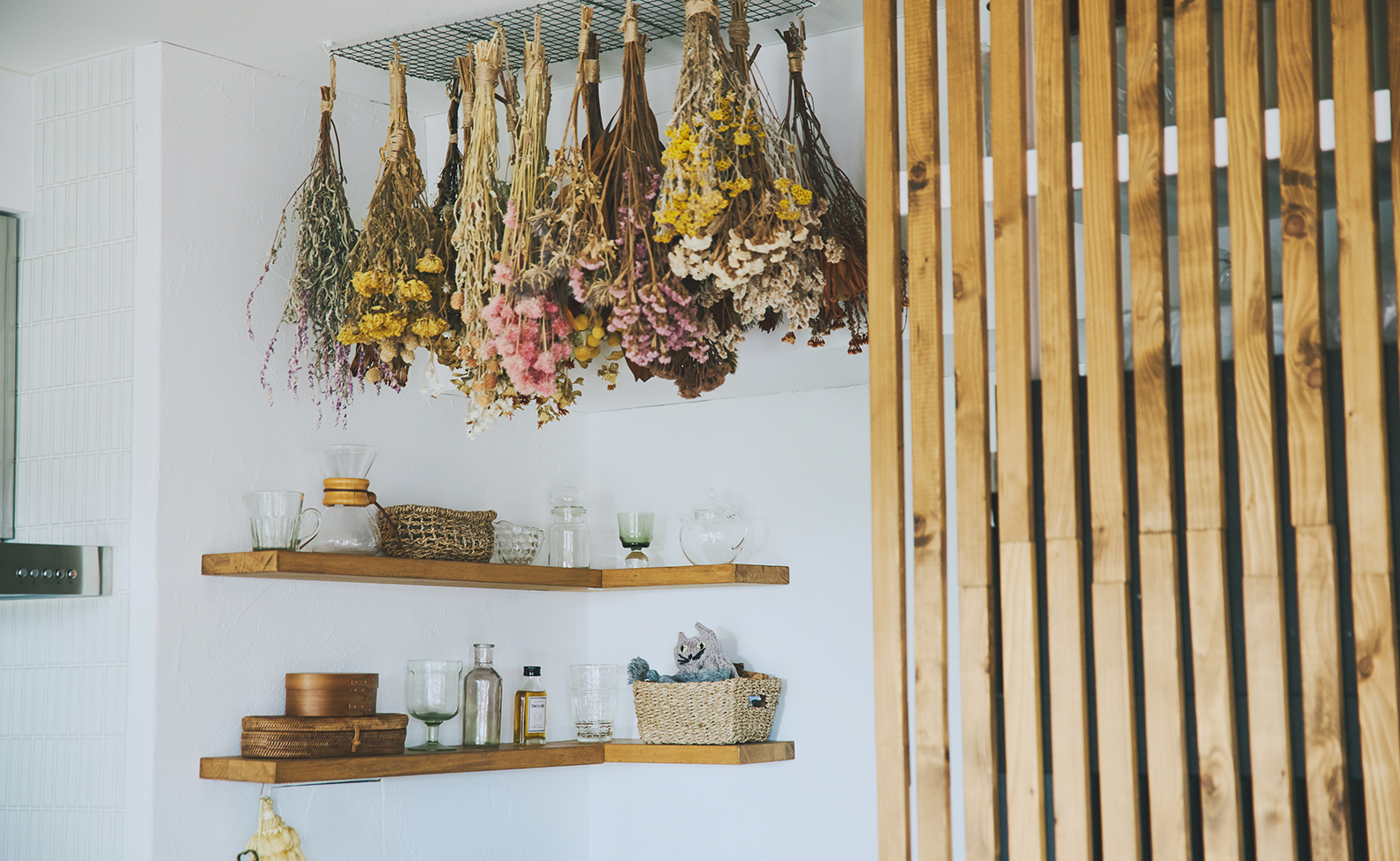 ドライフラワーを吊るすアイデアです。天井に穴が目立たないフックを取り付け、デッドストックの焼き網を引っ掛けてドライフラワーを飾っています。ドライフラワーは〈TODAY’S SPECIAL〉で購入したもの。農家さんが専門で作っているそうで、色持ちが驚くほど良いんです。古くなったら新しいものに入れ替えながら楽しんでいます。