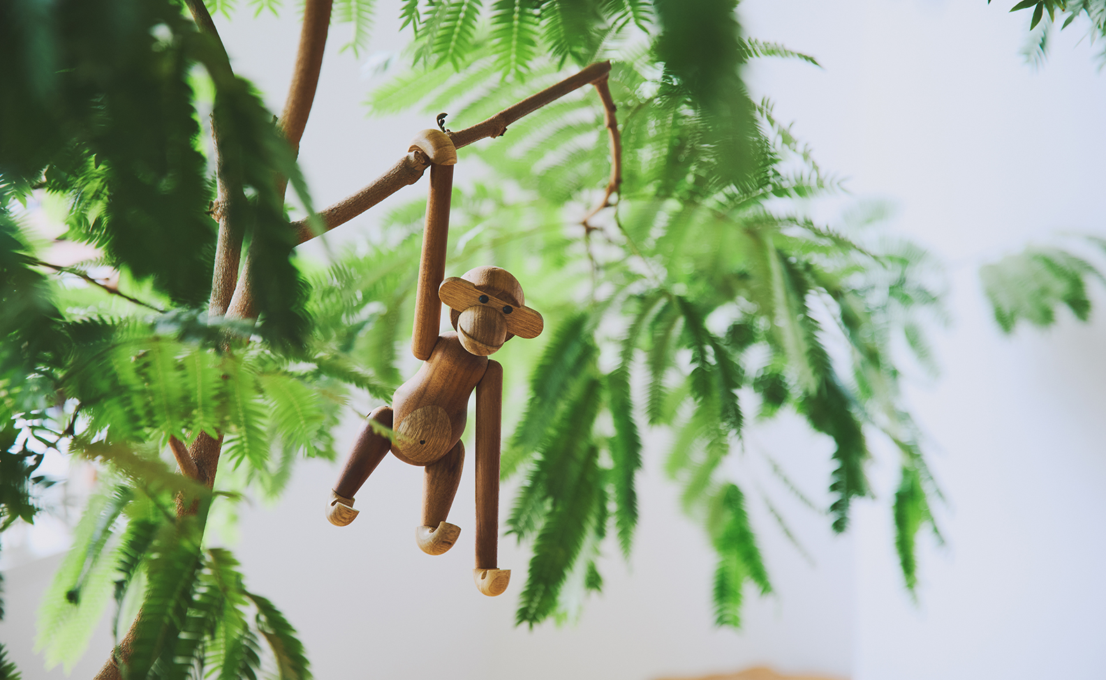 年に一度ほど、夫の故郷・デンマークに帰省するのですが、そのとき出会ったものが多いです。デンマークを代表する陶磁器ブランド〈Kähler〉の白い家のキャンドルホルダーや、〈カイ・ボイスン〉のモンキー、空港でも買える鳥のオブジェなど。
