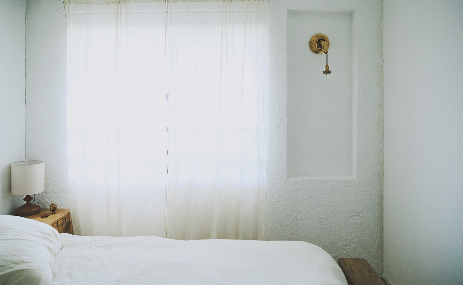 朝、光が漏れないように窓の端を隠すように壁を作りました。テレビボードと同じ要領で、突っ張り棒とプラスチックダンボールを組み合わせて制作。テレビボードでは、壁紙仕上げにしたのですが、上手に貼るのが難しかったため、こちらは漆喰風に仕上がる塗料を手塗りしました。