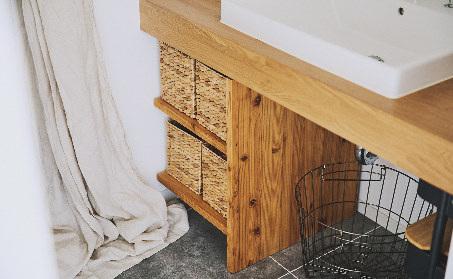 洗面所の床には〈東リ〉の建材タイルと目地を敷き詰め、洗面台の下には棚をDIYしました。身だしなみ用品やゴミ箱なども収納できるようにしています。